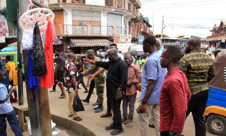 At Adehyee Market, the Mayor observed an overflow of waste that had eroded a stretch of the road due to poor drainage. He directed that traders on the slabs and pavement be relocated for at least a day to allow for a thorough assessment of the drainage and find a lasting solution to the problem.